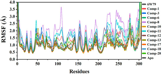RMSF was calculated to observe the fluctuation in different regions of Mpro upon ligand binding during the simulation. The main purpose was to see the effects of ligand binding on the flexibility of each residue of protein. The RMSF graphs of all complexes and apo–Mpro are shown in Figure 3. The results show that compound 8 increased the flexibility of all regions of the Mpro–8 complex as compared to the apo–Mpro, Mpro–X77 complex, and complexes of the rest of the selected hits from the in-house database. The apo–Mpro showed the lowest RMSF as compared to the ligand-bound states, reflecting that the protein is not very flexible in the un-ligated state. The average RMSF of all the systems was found in the range of 1.5 Å. The Mpro–3, Mpro–8, Mpro–11, and Mpro–28 complexes exhibited high flexibility, while the flexibility of Mpro–10 and Mpro–13 complexes was low. The loops in the protein structure fluctuated the RMSF at different regions. The Mpro–1, Mpro–6, Mpro–12, Mpro–17, and Mpro–18 complexes depicted lower flexibility due to the differential dynamics upon ligand binding. The secondary structures with loops are responsible for the fluctuation in the RMSF at different levels, justifying the residual flexibility. The flexibility of complexes with the selected eleven hits varies as compared to the apo–Mpro and X77-inhibited states (Figure 3).