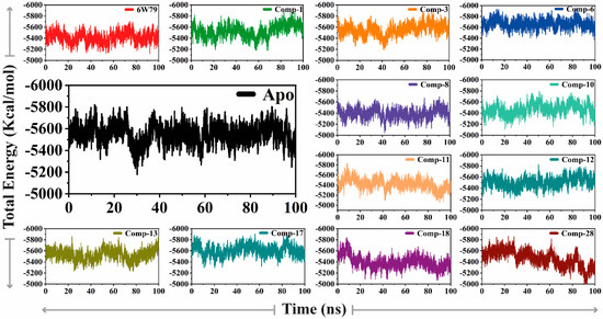 The total energy of the apo–Mpro was stable (energy = −5600 kcal/mol), while the Mpro–X77 exhibited slightly lower energy (−5400 kcal/mol) as compared to apo–Mpro. The Mpro–8, Mpro–11, Mpro–18, and Mpro–28 complexes revealed a similar energy pattern (in the range of −5400 kcal/mol to −5200 Kcal/mol), whereas the Mpro–10 and Mpro–13 complexes possess slightly higher total energy (between −5500 kcal/mol and −5700 kcal/mol) than the apo–Mpro. The Mpro–1, Mpro–3, Mpro–6, Mpro–12, and Mpro–17 complexes showed increased total energy ranging from −5600 kcal/mol to −5800 kcal/mol (Figure 4). The inhibited states of Mpro shared similar patterns and variations as compared to the apo form, therefore showing the effects of deviation on the structure of the protein created by each inhibitor.