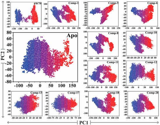 The PCA analysis of apo–Mpro and inhibited states of Mpro. Principal component 1 (PC1) and principal component 2 (PC2) were plotted against each other using the backbone carbon atoms.