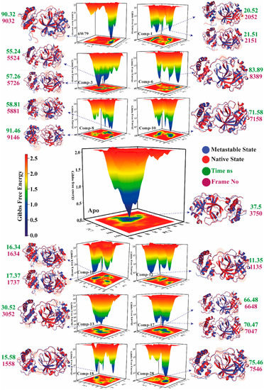 The free energy landscape (FEL) of free state and inhibited states is shown. High and low energy states are shown in distinct colors in the plot. The minimal, intermediate, and the high energy states are presented in dark blue, yellow, and red, respectively. The time of the metastable states (ns) and frame number is presented in green and purple, respectively. The metastable states and the native structures of Mpro are depicted in cartoon model in blue and red, respectively.