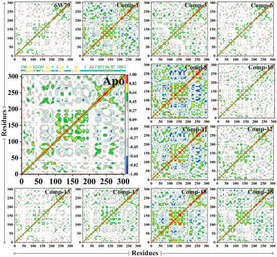 The dynamic cross-correlation map (DCCM) method was used to obtain the Cα atom’s time subordinate movements caused by the attachment of a small molecule (inhibitor) with the protein. The correlation matrix was derived by observing the Cα atoms’ correlated and anti-correlated motions of each system. DCCM was calculated by Equation (5).