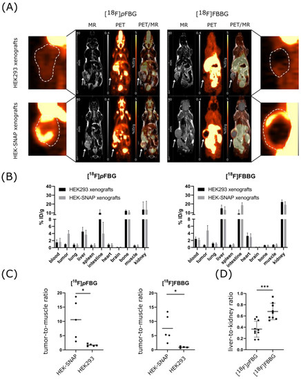 The promising in vitro results encouraged subsequent in vivo studies for assessment of xenograft uptake and pharmacokinetics of the ligands [18F]pFBG and [18F]FBBG in a pilot study in mice bearing SNAPTag-expressing xenografts. Indeed, both [18F]pFBG and [18F]FBBG demonstrated excellent xenograft uptake with very low endogenous background uptake in non-transfected tumors. Immunofluorescence microscopy revealed a loss of SNAPTag expression in the xenograft core that correlated with a lower expression of the proliferation marker Ki67, which could be caused by the relatively large xenograft size. The high abdominal uptake due to the excretion of the radiotracers implies that optimal contrast can be achieved within extra-abdominal tissues. Additionally, the radiotracers seem not to cross the blood–brain barrier (BBB), limiting their use for brain-related applications in individuals where the BBB has not been compromised. [18F]pFBG exhibited a significantly lower (p = 0.0002) liver-to-kidney ratio after 1h compared to [18F]FBBG (Figure 3D), driven by the rapid clearance from the liver in accordance with the TACs (Figure 4B). However, [18F]pFBG suffers from rapid defluorination of the molecule in vivo despite appearing stable in serum. Changing the position of the radiolabel ([18F]mFBG) did not result in the improvement of metabolic stability when tested in naïve animals, limiting the application of both FBG radiotracers in mouse models. However, since murine metabolism differs drastically from human metabolism the relevance of this phenomenon for potential clinical applications has to be addressed in future studies. Additional chemical modifications of [18F]pFBG addressed in future work might result in increased metabolic stability [27].