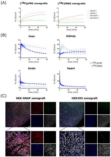 Pharmacokinetic evaluation of [18F]pFBG and [18F]FBBG, and ex vivo immunofluorescence. (A) TACs of the individual xenografts. HEK-SNAP xenografts are plotted in red and HEK293 control xenografts in green. (B) TACs of liver, kidney brain and heart for [18F]pFBG (dark blue) and [18F]FBBG (light blue) (n = 4). (C) Representative immunofluorescence images of HEK293 xenograft tissue and HEK-SNAP xenograft tissue. CD31 is stained in green, Ki67 blue, nuclei are displayed in grey and the SNAP protein was visualized by an anti-myc-tag antibody shown in red.