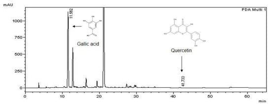 Previously, we have reported the phytochemical profiling by LC-MS of CM methanol extract used in the current study []. The major compounds in the extract included gallic acid and quercetin, which were shown to possess neurite outgrowth activity [,,,]. Hence, the amount of these compounds was quantified. The HPLC chromatogram of CM methanol extract showed peaks representing gallic acid and quercetin at the retention time of 11.56 and 41.73 min, respectively (Figure 1). Based on the calculations of the external standard, the methanol extract contained gallic acid and quercetin at 7815.17 ± 25.09 mg and 36.33 ± 0.51 mg of compounds per 100 g crude extract, respectively.
