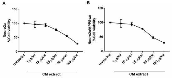 To select the optimal concentration of CM methanol extract, an MTT assay was employed to assess cellular toxicity of the extract at a series of different concentration. After treatment of Neuro2a and Neuro2a/APPSwe cells with the various concentrations (1, 10, 25, 50, and 100 µg/mL) of CM extract for 48 h, a concentration-dependent toxicity effect in both neuronal cell lines with more than 50% reduction of viable cells at the high concentrations tested (25, 50 and 100 µg/mL) was observed. The maximum concentration of the extract that produced acceptable toxicity with a minimum cell viability of 90% in both Neuro2a and Neuro2a/APPSwe cells was found at 10 µg/mL (94.08 ± 4.98% and 93.78 ± 5.56%, respectively) (Figure 2A,B). According to these results, 10 µg/mL of CM methanol extract was, therefore, selected for subsequent experiments.