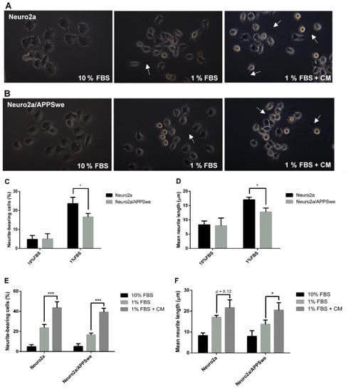 Serum deprivation is a condition for inducing neurite outgrowth in Neuro2a cells []. Therefore, we investigated neurite outgrowth activity of Neuro2a and Neuro2a/APPSwe cells after treatment in 1% FBS differentiation medium (with or without CM extract). The complete medium containing 10% FBS was used as an undifferentiated control. Neuronal morphology after treatment with the different conditions for 48 h is shown in Figure 3A,B. We first investigated the effect of APP overexpression on neurite outgrowth activity. Neuro2a and Neuro2a/APPSwe cells were cultured in differentiation medium containing 1% FBS or complete medium containing 10% FBS (control) for 48 h. After culturing the cells in 1% FBS medium, the neurite outgrowth of Neuro2a and Neuro2a/APPSwe cells was increased in both cell types as percent of neurite-bearing cells (23.62 ± 3.27% and 16.56 ± 1.87%, respectively) and as the mean of the longest neurite length (17.01 ± 0.92 µm and 13.73 ± 1.97 µm, respectively) compared to the cells cultured in 10% FBS medium. When the comparison was done between cell lines, both percent of neurite-bearing cells and the mean of longest neurite length after treatment of differentiation medium were found to be significantly lower in Neuro2a/APPSwe cells than in Neuro2a cells (p-value = 0.03 and 0.02, respectively) (Figure 3C,D).