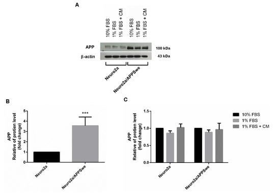 APP expression level. (A) Western blot analysis revealed that APP expression in Neuro2a/APPSwe cells was higher than that in Neuro2a cells. (B) In 1% FBS medium, APP was significantly different between wild-type cells and APPSwe-overexpressing Neuro2a cells (C) The APP levels between treatment groups of Neuro2a and Neuro2a/APPSwe cells were normalized vs. the 10% FBS group for each cell type. The analysis showed that Neuro2a/APPSwe cells exhibited higher levels of APP than Neuro2a cells. APP level in both cells did not differ in 10% FBS, 1% FBS, and 10 µg/mL CM extract in 1% FBS treatment. Values are mean ± SD of at least three independent experiments. *** p-value < 0.001.