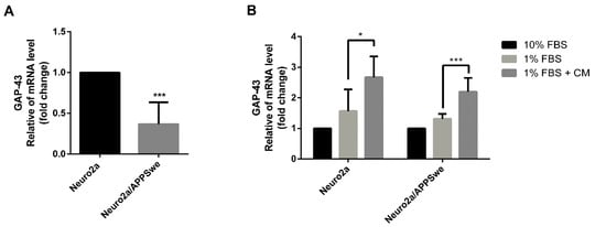 GAP-43 mRNA expression level. (A) Neuro2a/APPSwe cells showed significant lower GAP-43 gene expression than Neuro2a cells after induced differentiation by 1% FBS medium for 48 h. (B) The GAP-43 mRNA levels between treatment groups of Neuro2a and Neuro2a/APPSwe cells were normalized vs. 10% FBS group for each cell type. Neuro2a and Neuro2a/APPSwe cells significantly increased the expression of GAP-43 gene when treated with 10 µg/mL of CM extract for 48 h compared to 1% FBS treatment. Values are mean ± SD of at least three independent experiments. * p-value < 0.05, *** p-value < 0.001.