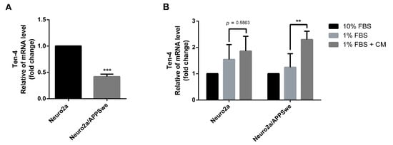 Ten-4 mRNA expression level. (A) Neuro2a/APPSwe cells showed significant lower Ten-4 gene expression than Neuro2a cells in 1% FBS medium after 48 h treatment. (B) The relative Ten-4 mRNA levels between treatment groups of Neuro2a and Neuro2a/APPSwe cell groups were normalized by 10% FBS group from each cell type. Ten-4 gene expression significantly increased in both Neuro2a and Neuro2a/APPSwe cells when treated with 10 µg/mL of CM extract for 48 h compared to 1% FBS treatment in each cell. Values are mean ± SD of at least three independent experiments. ** p-value < 0.01, *** p-value < 0.001.