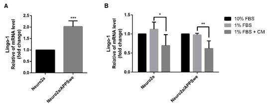 Lingo-1 mRNA expression level. (A) Neuro2a/APPSwe cells showed significant higher Lingo-1 gene expression level than Neuro2a cells in 1% FBS medium after 48 h treatment. (B) Lingo-1 mRNA level between treatment groups of Neuro2a and Neuro2a/APPSwe cells was normalized vs. 10% FBS group for each cell type. Lingo-1 gene expression level was significantly increased in both Neuro2a and Neuro2a/APPSwe cells when treated with 10 µg/mL of CM extract for 48 h compared to 1% FBS treatment in each cell. Values are mean ± SD of at least three independent experiments. * p-value < 0.05, ** p-value < 0.01, *** p-value < 0.001.