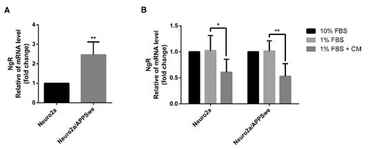 The gene expression of Nogo receptor (NgR), a downstream signaling protein of Lingo-1, was further investigated. Under a differentiated condition induced by 1% FBS medium control, the APP-overexpressing Neuro2a cells exhibited a significant higher NgR mRNA expression (2.46-fold) than wild-type Neuro2a cells (p-value = 0.0029) (Figure 8A). As observed for Lingo-1 gene expression, the NgR mRNA expression was not different between Neuro2a and Neuro2a/APPSwe cells treated with 10% FBS or 1% FBS medium controls, whereas it significantly decreased in both cell lines (p-value = 0.0392 and 0.0028, respectively) after exposure to 1% FBS medium plus 10 µg/mL CM extract for 48 h compared to 1% FBS medium control alone (Figure 8B).