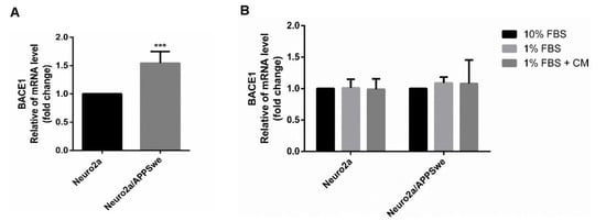 BACE1 mRNA expression level. (A) Neuro2a/APPSwe cells showed significantly higher level of BACE1 gene expression than Neuro2a cells after 48 h of treatment in 1% FBS medium. (B) BACE1 mRNA level between treatment groups of Neuro2a and Neuro2a/APPSwe cells was normalized vs. 10% FBS group for each cell type. BACE1 gene expression level in both Neuro2a and Neuro2a/APPSwe cells was not altered when treatment with 10 µg/mL of CM extract for 48 h compared to 1% FBS treatment in each cell. Values are mean ± SD of at least three independent experiments. *** p-value < 0.001.