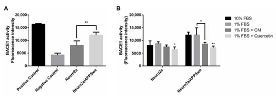 BACE1 activity expressed as fluorescence intensity unit per 30 µg of protein sample. (A) Neuro2a/APPSwe cells showed significantly higher level of BACE1 activity than Neuro2a cells after 48 h of treatment in 1% FBS medium. The enzyme activity correlated with the enzyme concentration. (B) Quercetin (1 µM), a well-known BACE1 inhibitor, significantly decreased the enzyme activity in both cells. BACE1 activity in Neuro2a/APPSwe cells significantly decreased upon treatment with 10 µg/mL of CM extract for 48 h compared to 1% FBS treatment, and it slightly decreased in Neuro2a cells. Values are mean ± SD of at least three independent experiments. * p-value < 0.05, ** p-value < 0.01.