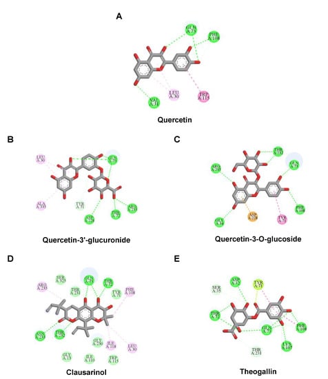 Diagrams represent protein–ligand interactions. Schematics of amino acid interactions of BACE1 and candidate ligands: (A) quercetin, (B) quercetin-3′-glucuronide, (C) quercetin-3-O-glucoside, (D) clausarinol, and (E) theogallin. Green dashes indicate hydrogen bonds. Pink dashes indicate hydrophobic bonds. Orange dash indicates electrostatic bond.