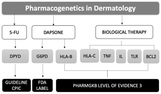 This literature review presents the information currently available on pharmacogenetically significant drugs used to treat skin diseases. In particular, it indicates the recommendations in PGx clinical guidelines for 5-fluorouracil, specifically when used topically in patients diagnosed with actinic keratosis and/or basal-cell carcinoma, and the PGx recommendation in the summary of product characteristics for the drug dapsone when administered systemically to treat dermatitis herpetiformis. Finally, it highlights the most important PGx studies on biologic therapies indicated for hidradenitis suppurativa and moderate-to-severe psoriasis (Figure 1).