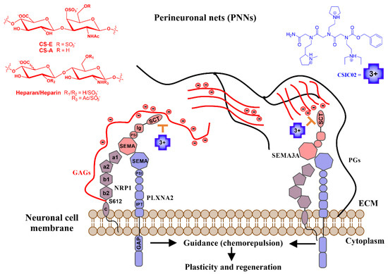 The extracellular matrix (ECM) is a dynamic three-dimensional network of macromolecules that offers structural support for the cells and tissues and provides a microenvironment that regulates neural cell development and activity [1]. One of the building blocks of these networks are the proteoglycans (PGs). Proteoglycans are constituted by core proteins and one or several attached glycosaminoglycan (GAG) chains. PGs are present in ECM and on the cell membrane surface. GAGs play numerous biological roles mediated by the interaction with a variety of proteins [2,3,4,5]. GAG–protein interactions participate in a variety of human diseases, including cardiovascular diseases, infections, neurodegenerative processes, and tumors [6,7]. Numerous experiments have established that the protein Semaphorin 3A (Sema3A) co-localizes with both cell surface and ECM chondroitin/heparan sulfate proteoglycans (CSPGs/HSPGs) [8,9,10]. Sema3A interacts with CSPGs in perineuronal nets (PNN, one form of ECM in the central nervous system (CNS)), depending, among other features, on the sulfation pattern [10,11,12,13]. Early data showed that heparin enhances Sema3A binding to neuropilin-1-expressing cells and potentiates its growth cone collapsing activity [8]. Sema3A modulates PNN plasticity and the coexistence of both Sema3A and chondroitin sulfate (CS) on the neuronal surface gives stronger plasticity restriction in PNN [13]. These studies support the contribution of CSPGs to the Sema3A-Nrp-Plxn (Nrp = Neuropilin; Plxn = Plexin) signaling complex (Figure 1).
