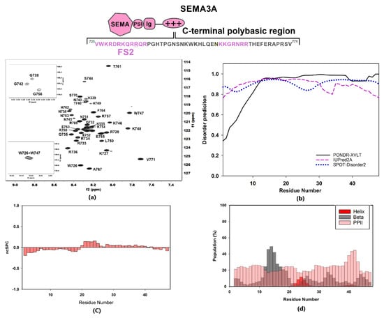 Structural characterization of Sema3A C-terminal domain. The scheme shows the amino acid sequence for Sema3A C-terminal region (SCTWT) and the peptides studied in our previous work (labeled in dark rose) [40]. For these Sema3A peptides, we used the terms FS2 and (N)FS3 (for Furin processing sites 2 and 3). (a) [1H,15N]-HSQC spectrum of 13C,15N-labeled Sema3A C-terminal region at pH 5 (10 mM of acetate and 50 mM of NaCl, 298 K) with the assignment for backbone amides. (b) Bioinformatics analysis of the intrinsic disorder predisposition of the Sema3A C-terminal region obtained using IUPred2A, PONDR® VLXT, and SPOT-Disorder2. Disordered segments are indicated by values higher than the default cut-off (0.5), lower values predict structured regions. (c) Structural propensity plot using ncSPC (neighbor connected structural propensity plot). (d) Estimation of secondary structure populations using δ2D. Red bars indicate helical population estimate, grey bars indicate beta population estimates, dark rose bars indicate PPII population estimates, and remaining white is % of random coil. Chemical shift values for HN, N, C’, Cα, and Cβ nuclei were used for (c,d) graph calculations.
