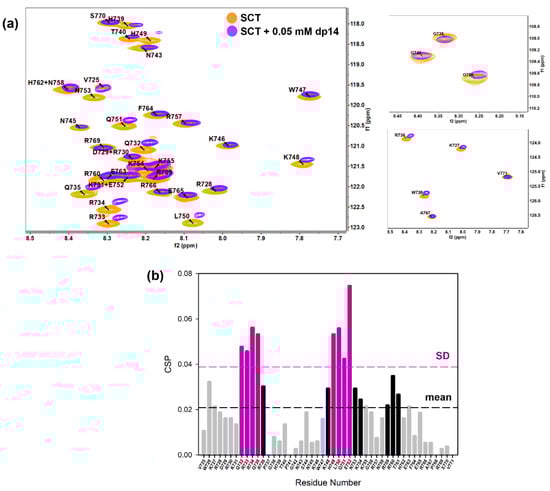 Figure 4a illustrates the chemical shift perturbation of the backbone amide groups of SCTWT (0.2 mM) in the presence of 0.05 mM (or 0.35 mM in disaccharide units) dp14 heparin oligosaccharide. NMR signals retained low dispersion, showing that the protein remains disordered and flexible in the complex. As shown in Figure 4a, binding to dp14 heparin causes a loss of intensities and significant chemical shift changes in specific regions. Furthermore, we essentially observed a resonance shift upon addition of dp14 heparin, implying a fast exchange on the NMR time scale between the free and the heparin bound states. The chemical shift map (Figure 4b) reveals pronounced chemical shift changes (black line cutoff = CSP mean) for residues in sequences 732QRRQR736 and 748KHLKENKK755, while mild changes for residues Trp726 and Arg760. Some of them belong to the typical GAG-binding motif –XmBBXm- (XBBXBBXBBX, as FS2 peptide 725VWKRDRKQRRQR736), where B is a basic amino acid and X is a hydrophilic amino acid [58,59]. However, the region corresponding to NFS3 peptide (NKKGRNRR), with the known GAG-binding motif –XBBXBX-, experienced considerably smaller chemical shift variations. This observation is in good agreement with our SPR results using SCT peptides, with a 60-fold stronger affinity to heparin of FS2 peptide compared to NFS3 peptide (Table S3). The second most perturbed site, 748KHLKENKK755, has a sequence –Bn-X2-Bn- also commonly observed as a GAG-binding pattern. NMR experiments show that the most perturbed residues are distributed in two adjacent zones and the contribution of the initially predicted GAG-binding region around Furin site 3 ((N)FS3) is smaller. Nevertheless, CSP may not only be triggered by direct binding and other causes, as changes in conformation or chemical environment after heparin binding, could originate the observed changes.