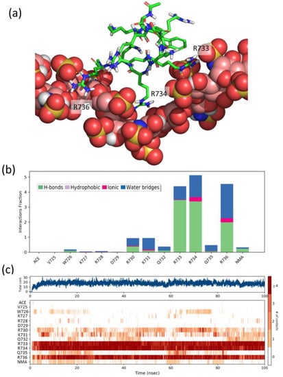 (a) Representative snapshot of the heparin/FS2 simulation. Heparin is shown as CPK balls and FS2 as sticks. (b) Interactions fraction per FS2 residue. The stacked bar charts are normalized over the course of the trajectory, such that a value of 1.0 suggest that the interaction is maintained over 100% of the simulation time. Values over 1.0 are possible as some residues may establish multiple contacts of same subtype. (c) Time dependence of the total number of interactions and of interactions between each residue of peptide FS2 and heparin. Numbering of peptide residues according to Sema3A sequence, ACE, and NMA correspond to acetyl and N-methylamide capping groups of the N- and C-termini.