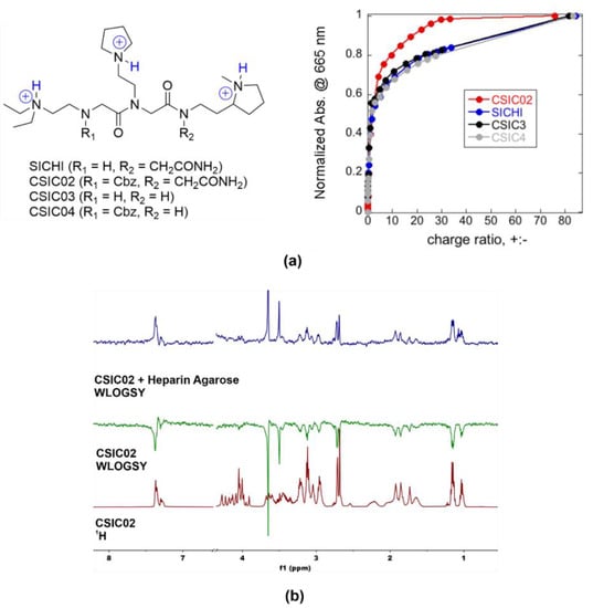 (a) Chemical structures of triprotonated SICHI and CSIC02–04, as the main species in aqueous medium at neutral pH, and relative increase in MB absorbance at 665 nm versus charge ratio after the addition of the peptoids to the preformed MB/heparin complex (4.71 µM Hep repeating units + 9.83 µM MB in 5 mM Tris buffer at pH = 7.5). (b) 1D 1H WaterLOGSY NMR experiments showing that CSIC02 binds to heparin agarose resin (used as a GAG mimetic).