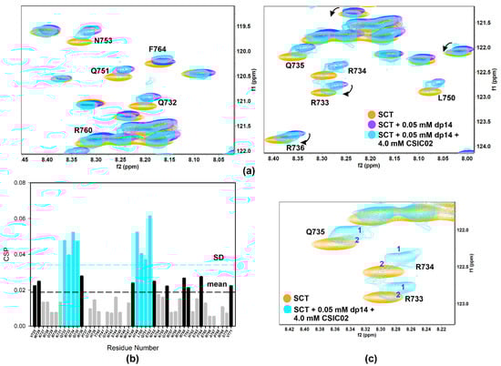 NMR competition experiments involved the acquisition of 1D-1H WaterLOGSY or spin-lock filtered NMR spectra. Thus, FS2 peptide is displaced from heparin agarose resin by CSIC02 (1:1 peptoid/FS2, both 1 mM), but not by CSIC03 (Figure S15). Moreover, spin-lock filtered 1D-1H NMR confirmed that CSIC03 and CSIC04 were incapable to displace FS3 peptide from heparin agarose resin (Figure S16). We reasoned that if CSIC02 was able to interact with GAG and displace FS2/FS3 basic peptides, it may also interfere with SCTWT–heparin interaction. To investigate if CSIC02 could displace SCTWT from heparin dp14 and to define the SCTWT residues affected, 2D NMR 1H-15N HSQC CSP experiments were used. Figure 8a illustrates the chemical shift effects of CSIC02 addition to a sample of SCTWT containing dp14 heparin. To discard direct effects of CSIC02 on the protein chemical shift, a control experiment mixing SCTWT and CSIC02 was acquired which showed that CSIC02 only shifts F764 and V771 amide resonances (Figure S17), and neither of the two residues intervene on the SCTWT binding to GAGs. In Figure 8b, we display the chemical shift perturbation of SCTWT NMR spectra in the presence of dp14 and CSIC02. Thus, as the two CSP plots in Figure 4b and Figure 8b were calculated using as reference SCTWT alone in solution, we can compare them directly. We observed that the addition of a molar excess of CSIC02 caused a modest decrease in dp14-induced perturbations in the HSQC spectrum of SCTWT. Moreover, splitting of signals for some residues (R733, R734, and Q735 in the first GAG-binding region) was observed (Figure 8c). This observation is compatible with the presence of different species in slow chemical exchange in solution, with partial detachment of SCTWT from heparin. The amount of CSIC02 used in these experiments can be rationalized considering that the SCTWT has ca. 12 positive charges at neutral pH (Figure S18), while CSIC02 is tricationic. Since the binding is mediated by ionic polar interactions, a large excess of CSIC02 is needed to counterbalance the SCTWT-dp14 binding [64].