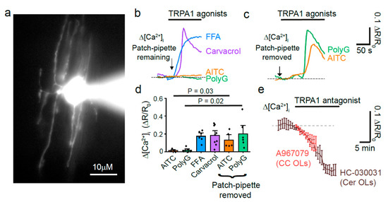 Corpus callosum oligodendrocytes express TRPA1. (a) High magnification of a whole-cell patch clamped OL in corpus callosum (CC) with Alexa dye in the soma and processes. (b) Representative Δ [Ca2+]i trace responses to TRPA1 agonists with the patch-pipette remaining: FFA 100 µM (n = 6); carvacrol 2mM (n = 8); 500 µM AITC (n = 4); polygodial 100 µM (n = 6). (c) Δ [Ca2+]i to TRPA1 agonists with the patch-pipette removed: AITC 500 µM (n = 5); polygodial 100 µM (n = 6). (d) Mean ± SEM maximum Δ [Ca2+]i in response to TRPA1 agonists (p-values compared with and without patch pipette, one-way ANOVA test with Holm-Bonferroni correction for multiple comparisons). (e) The graph shows a decrease in resting [Ca2+]i that occurs in the presence of TRPA1 antagonists: A-967079 20 µM in CC Ols and HC-030031 100 µM in cerebellar (Cer) OLs.