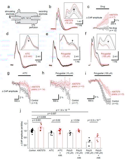 White matter Ca2+ concentrations, and receptors that allow Ca2+ flux, have been suggested to regulate action potential propagation in disease [12,13,14,15,16]. As TRPA1 regulates intracellular Ca2+ concentrations in oligodendrocytes, we hypothesised that tonic TRPA1 activity may influence oligodendrocyte function in maintaining fast neuronal action potential propagation. We used the optic nerve to measure CAP amplitude as described previously ([15,17]; Figure 2a) because it is a heavily myelinated, easily accessible CNS white matter tract [13]. Interestingly, we discovered a modest regulation of CAP amplitude by tonic TRPA1 activity in the optic nerve as TRPA1 inhibition with A-967079 (20 µM) increased the amplitude by 12 ± 4% within 10 min (n = 9; Figure 2b,c). Conversely, the TRPA1 agonists AITC (500 µM; n = 8; Figure 2d,g), and polygodial (10 or 100 µM; n = 6–7; Figure 2e,f,h,i) reduced the CAP amplitude (n = 5–14; Figure 2j). The TRPA1 agonist-induced decrease in compound action potential amplitude was reduced in the presence of A-967079, which was preincubated for over 15 min to allow for the initial increase in CAP amplitude before application of the agonists (n = 5–14; Figure 2j). As optic nerves do not include neuronal somata, these results indicate glial TRPA1 regulates retinal ganglion cell CAP propagation in physiological conditions. Whether this is due to OL or astrocyte TRPA1 is yet to be determined.