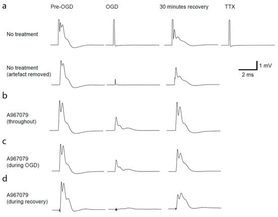 Ischaemia-evoked changes in optic nerve compound action potential (CAP). (a) Top row, traces from the left are: CAP in control solution, after 30 min ischemia, after 30 min recovery to control solution, after application of 500 nM TTX to record the stimulus artefact. Row b shows the same traces after the stimulus artefact has been removed from the traces. (b–d) Artefact subtracted responses with A-967079 (20 μM) preincubated and added throughout the experiment (b) during ischaemia only (c) or during the recovery only (d).