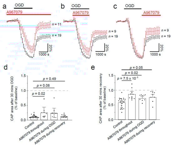 In the past, CAP recordings have demonstrated that simulated ischaemia results in a reduction in action potential propagation, with only a partial recovery [14,15,18,19,20]. This reduction in CAP amplitude is thought to be mediated by Ca2+ influx through different channels; therefore, TRPA1 inhibition may protect against loss of CAPs during ischaemia. To simulate ischaemia we removed O2 and glucose for 30 min, and continually recorded the CAP during a recovery period of 30 min (Figure 3). The area under the curve of the CAP was measured throughout. To understand the time at which TRPA1 activation may cause the most damage, we applied A-967079 at different times during the experiment. Firstly, we preincubated A-967079 (20 µM) and administered it throughout the experiment and found it significantly reduced the loss of the CAP during ischaemia (Figure 3b, and Figure 4a,d; p = 0.02) and improved the recovery from 61 ± 3.7% to 89 ± 7.4% (Figure 4a,e; p = 7.5 × 10−5). As therapeutics are more often than not given either during or after the event rather than prophylactically, we applied A-967079 during either the ischaemic insult or only the recovery period (Figure 3c,d and Figure 4b–e). A-967079 application during the ischaemic insult or the recovery period alone resulted in an improved CAP recovery (77 ± 8%; p = 0.02 and 73.7 ± 4%; p = 0.05, respectively) suggesting that the TRPA1-mediated damage is occurring during both the ischaemic and recovery periods. These results suggest that TRPA1 activation during ischaemia is a major cause of white matter damage and that TRPA1 antagonists may be effective in treating white matter in the many diseases involving ischaemia.