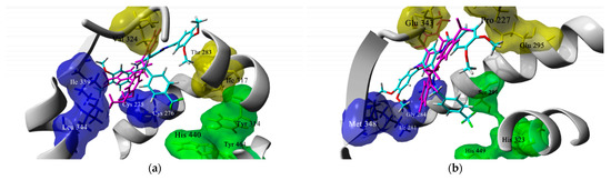 Predicted docking poses for compound 48a (magenta) and 1b (CPK, carbon atoms in cyan) in their complexes with (a) PPAR-α; (b) PPAR-γ. Green and blue-colored residues correspond to the binding pockets of known dual PPAR partial agonists, and yellow residues describe additional binding sites. See discussion section for details.