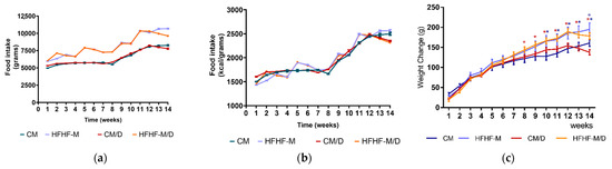 Effect after 14 days of compound 1b administration on food intake and weight change on the MetS animal model (a) food consumption, (b) calorie intake, (c) weight change. HFHF-M and HFHF-M/D groups presented a statistically significant increase in kg/cal consumption compared to control (CM and CM/D) groups, observing significant weight differences between groups from week 8 to week 12. After 14 days of treatment with compound 1b, the HFHF-M/D group had a reduction of weight change on both treated groups (CM/D and HFHF/D) being non-statistically significant between HFHF-M and HFHF-M/D. Data are presented as means ± standard deviation (SD). * Represents statistically significant differences between groups compared to their own control group (CM vs. HFHF-M) (CM/D vs. HFHF-M/D) (p < 0.05). The color of the * represents which group is the compared to their control.