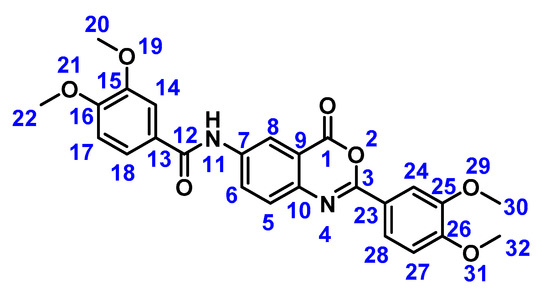 To a round bottom flask equipped with a magnetic stirrer and ice bath, 100 mL of pyridine were added. Afterward, 3,4-dimethoxybenzoyl chloride (5.24 g, 26.0 mmol) was added and vigorously stirred until its complete dissolution. After 10 minutes, compound 4 (1.3 g, 8.7 mmol) was added and stirred for 2 h at 5 °C. Once the reaction was completed, 250 mL of water were added, and a white precipitate was immediately formed, which was then filtered, washed with ethanol, and dried under reduced pressure to afford the desired product 5 as a yellowish solid in 91% yield. m.p. > 250 °C, IR (KBr, cm−1): 3335 (N-H), 1709 (C=O, benzoxazinone), 1632 (C=O, amide), 1590 (C=C, aromatic), 1201 (O–CH3). 1H NMR (DMSO-d6, 500 MHz) δ = 10.44 (1H, s, H11), 8.60 (1H, d, J = 2.7 Hz, H8), 8.24 (1H, dd, J = 2.7, 9.1 Hz, H6), 7.75 (1H, dd, J = 1.8, 8.7 Hz, H28), 7.68 (1H, d, J = 8.8 Hz, H5), 7.64 (1H, d, J = 1.8 Hz, H24), 7.62 (1H, dd, J = 2.1, 8.4 Hz, H18), 7.53 (1H, d, J = 2.1 Hz, H14), 7.12 (1H, d, J = 8.7 Hz, H27), 7.08 (1H, d, J = 8.4 Hz, H17), 3.85 (1H, s, H30), 3.84 (1H, s, H32), 3.83 (1H, s, H20), 3.81 (1H, s, H22). 13C {1H} NMR (DMSO-d6, 125 MHz) δ = 165.72 (C12), 159.66 (C1), 155.74 (C3), 153.12 (C26), 152.48 (C16), 149.33 (C25), 148.89(C15), 142.71 (C10), 139.51 (C7), 129.28 (C6), 127.72 (C5), 126.86 (C13), 122.73 (C23), 122.07 (C28), 121.81 (C18), 118.13 (C8), 117.31 (C9), 111.54 (C14), 111.51 (C17), 110.44 (C24), 56.29 (C30), 56.25 (C32), 56.18 (C20), 56.12 (C22).15N {1H} NMR (DMSO-d6, 50.69 MHz) δ = −211.6591 (N11) (Note: See the Figure 7 above for atom numbering). MS (FAB, m/z): 463 (M+ + 1, 100%). Elemental analysis: experimental C, 65.41%; H, 5.02%; N, 5.76%; calculated C, 64.93%: H, 4.80%; N, 6.06%.