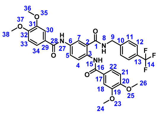 Compound 5 (2 g, 4.3 mmol) was added to an Erlenmeyer flask with a magnetic stirrer and an ice bath. Afterwards, 50 mL of DMF were added to the container, and the reaction mixture was stirred for 20 min at 5 °C until the precipitate was completely solubilized. Afterward, 4-(trifluoromethyl) benzylamine (1 g, 5.7 mmol) and 1 mL of acetic acid were added to the solution, which was then vigorously stirred for one day. After reaction completion, 100 mL of ice water were added, and a white precipitate was immediately formed. Finally, 5 mL of a 10% HCl solution were added to the reaction mixture in order to remove the excess of the benzylamine. The precipitate was then filtered, washed with hot hexane, and dried under reduced pressure to give 1a as a white solid in 72% yield. m.p. > 250 °C, IR (KBr, cm−1): 3335 (N-H), 2888 (9CH3, CH2), 1655, 1628 (C=O, amide), 1575 (C=C, aromatic), 1231 (O-CH3) 1H NMR (DMSO-d6, 500 MHz) δ = 11.82 (1H, s, H15), 10.20 (1H, s, H27), 9.43 (1H, t, J = 5.9 Hz, H8), 8.45 (1H, d, J = 8.9 Hz, H4), 8.21 (1H, d, J = 2.2 Hz, H7), 7.80 (1H, dd, J = 2.2, 8.9 Hz, H5), 7.64 (2H, d, J = 8.3 Hz, H12), 7.61 (1H, d, J = 1.2, 8.3 Hz, H34), 7.53 (3H, m, H11, H30), 7.42 (2H, m, H18, H22), 7.069 (1H, d, J = 9.0 Hz, H21), 7.063 (1H, d, J = 8.3 Hz, H33), 4.54 (1H, d, J = 5.9 Hz, H9), 3.813 (3H, s, H38), 3.810 (3H, s, H36), 3.80 (3H, s, H26), 3.76 (3H, s, H24). 13C {1H} NMR (DMSO-d6, 125 MHz) δ = 169.30 (C1), 165.33 (C16), 164.47 (C28), 152.38 (C20), 152.25 (C32), 149.14 (C19), 148.85 (C31), 144.44 (C10), 135.30 (C3), 134.74 (C6), 128.54 (11), 127.31 (C17), 127.23 (13C 2JC,F = 31.0 Hz), 127.03 (C29), 125.45 (C12, 3JC,F = 2.9 Hz), 125.24 (C5), 125.23 (C14, 1JC,F = 252.3 Hz), 122.20 (C2), 121.54 (C4, C34), 121.31 (C7), 120.42 (C17), 111.82 (C33), 111.47 (C21), 111.40 (C30), 110.86 (C22), 56.21 (C38, C36), 56.16 (C26), 55.94 (C24), 43.01 (C9).19F {1H} NMR (DMSO-d6, 470.62 MHz) δ = 5.91. (Note: see Figure 8 above for atom numbering). MS (FAB, m/z): 638 (M+ + 1, 100%). Elemental analysis: experimental C, 62.59%; H, 5.01 %; N, 6.28%; calculated C, 62.16%; H, 4.74%; N, 6.59%