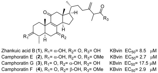Cytotoxicity of compound 1–4 isolated from T. camphoratus on KBvin cell lines.