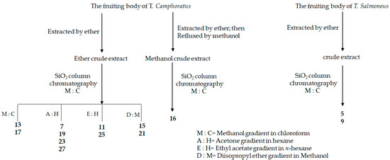 Following previous studies, a variety of zhankuic acid-type compounds were selected and gathered from our group based on their structures and available quantity. These compounds were isolated from the fruiting body of T. camphoratus and T. salmoneus [25,27,32,33]. The dried plant materials were extracted by ether or methanol, partitioned, and then undergone repeated silica gel chromatography with different eluents to obtain zhankuic acid type compounds. The isolation process is summarized in Figure 2 and the names and references are shown in Table 1 [25,27,32,33].
