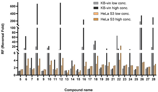 Collateral sensitivity of all the compounds was determined based on the anti-proliferative effects of both HeLa and KBvin cells under co-treatment with paclitaxel and the compounds. Reversal fold (RF), representing re-sensitizing activity, was defined as the IC50 value for the paclitaxel-only group divided by the IC50 value of the co-treatment. The results are shown in Table 3. Reversal folds among all derivatives are organized in Figure 3. It can be seen that the most potent compounds are 8, 12 and 26 with RF values of 666, 692, and 348, respectively.