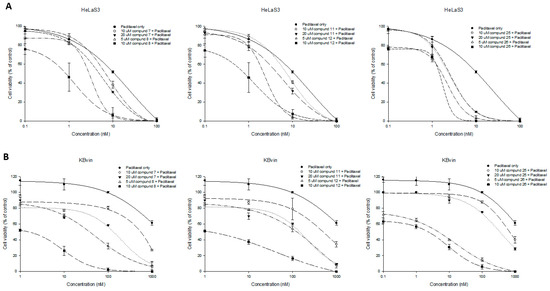 Dose–response curves of compounds 7–8, 11–12, and 25–26 in HeLa S3 (A) and KBvin (B).