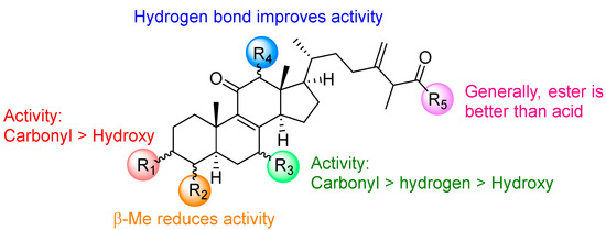 A summary of the structure–activity relationship (SAR) of triterpene derivatives are shown in Figure 5. In the R1 and R3 positions, the carbonyl substituent exhibited better chemoreversal ability than the other substituents. When the α-methyl substituent is epimerized to β-methyl in the R2 position, the inhibitory activity in KBvin cells was reduced. In the R4 position, the hydrogen bond improved the collateral sensitivity. Finally, the R5 ester derivatives were found to be more potent than their acid derivatives.