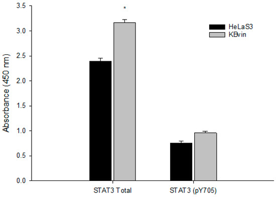 Baseline expression of STAT3 total and STAT3 phosphorylation in HeLaS3 and KBvin. * denotes p < 0.05 as compared to the vehicle control.
