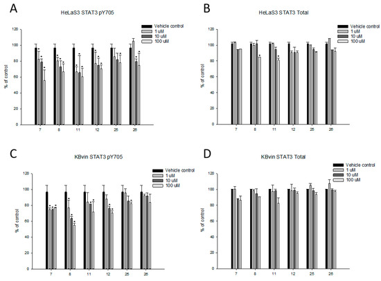Effects of the testing compounds on the expression of STAT3 phosphorylated at Tyr705 and total STAT3 proteins in the HeLaS3 cells (A,B) and KBvin cells (C,D). * denotes p < 0.05 as compared to the vehicle control.