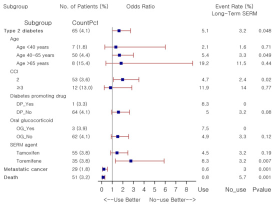To further investigate risk factors associated with an increased risk of T2DM among those who exposed to SERM for 1500 days or longer, subgroup analyses, stratified by age and CCI category and comedication patterns with diabetes promoting drugs and oral glucocorticoid, were performed between 1:1 PS-matched long-term users versus non-users (Figure 1). Here, we found that incident T2DM risk was substantially elevated in the stratum of 40 years to 65 years (OR 1.67, p = 0.049). The incidence of T2DM with long-term use of SERMs was higher in both diabetes promoting drugs exposure and oral glucocorticoid exposure strata, but risk analyses were not performed due to the scarcity of outcome events and limited number of patients belonging to each stratum. When assessed per individual agent, we found elevated risk of T2DM with long-term use of toremifene only (OR 2.75, p = 0.007). Glycemic control over the follow-up was comparable between groups as newly diagnosed patients are likely initiated with lifestyle modification measures along with hypoglycemic treatments as needed: the mean change in fasting glucose and HbA1c was 5.4 ± 43.5 versus 4.9 ± 33.3 mg/dL ( p= 0.88) and 0.1 ± 0.7 versus 0.3 ± 0.6% (p = 0.40) in long-term users and non-users, respectively. The risk of metastatic cancer and death was substantially decreased with long-term use of SERMs as compared with non-use: the OR was 0.20 (p < 0.001) and 0.13 (p < 0.001), respectively. Here, an increased risk of incident diabetes was assessed when SERM therapy lasted for ≥1500 days as compared to non-use, especially in those aged 40 years to 65 years, with CCI of 2, and who received toremifene. Detailed results are available in Table S2.