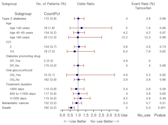 To explore potential risk factors associated with tamoxifen, the most frequently prescribed SERM agent, subgroup analyses were conducted using similar stratification methods as above by comparing 1:1 PS-matched tamoxifen users, irrespective of treatment duration, against non-users (Figure 2). No signal of increased risk of T2DM was observed in overall tamoxifen users as compared to non-users, nor in any of the strata per age, CCI, concomitant medications predisposing to diabetes, and treatment duration. Glycemic changes over the follow-up were not significantly different between groups: the mean change in fasting glucose and HbA1c was 4.3 ± 37.4 mg/dL versus 6.9 ± 43.7 mg/dL (p = 0.16) and 0.0 ± 0.5% versus 0.1 ± 0.7% (p = 0.66) in long-term users and non-users, respectively. Tamoxifen-receiving patients had a significantly lower risk of death than non-users (OR 0.56, p < 0.001), although metastatic cancer risk was not significantly different between groups. There was no significant risk of incident diabetes with tamoxifen use as compared to non-use. Detailed results are provided in Table S3.