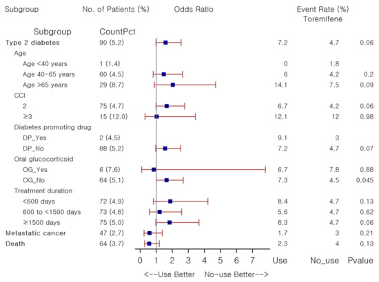 Subgroup analyses were repeated to explore potential risk factors associated with toremifene’s effects on T2DM risk, based on the similar stratification methods by comparing 1:4 PS-matched toremifene users, irrespective of treatment duration, against non-users (Figure 3). Toremifene was not associated with greater risk of T2DM than non-users, nor in most strata, except for the stratum of no oral glucocorticoid exposure, where higher T2DM risk was observed with toremifene use (OR 1.64, p = 0.045). Although the rate of new-onset diabetes was 1.8 times higher among long-term toremifene users than in non-users (8.3% versus 4.7%), it did not reach statistical significance (p = 0.06) in this PS-matched subgroup analysis. Glycemic changes over the follow-up were not significantly different between groups: the mean change in fasting glucose and HbA1c was 9.6 ± 64.8 mg/dL versus 5.2 ± 38.6 mg/dL (p = 0.50) and 0.1 ± 0.3% versus 0.1 ± 0.4% ( p = 0.10) in toremifene users and non-users, respectively. No substantial difference was observed in both the risk of metastatic cancer and death between groups. Here, as compared to non-users, a statistically significant risk of incident diabetes was detected in toremifene users who did not receive oral glucocorticoid concurrently. Detailed results are provided in Table S4.