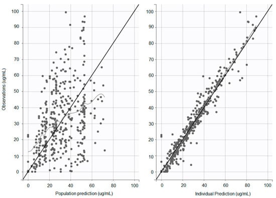 Individual and population concentration versus predicted concentration was observed; the population prediction shows a slight overestimation of low drug concentrations and underestimation of high drug concentrations (Figure 1).