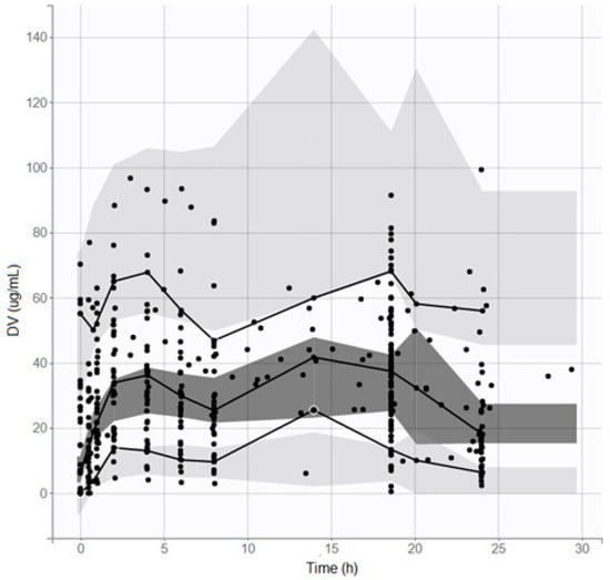 A bootstrap analysis was also performed in order to observe the accuracy of estimated pop PK parameters; 100 iterations were performed. All the popPK parameters of the model were between the 1st and 3rd quartiles.