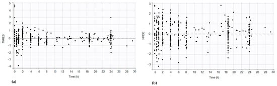 The popPK model was validated by observing the visual predictive check (VPC), with n = 1000 simulations (Figure 2), and the residual error and the NPDE were observed (Figure 3). A sinusoidal distribution of IWRES up to 8 h was observed, which is in line with the population prediction profile observed in Figure 1.