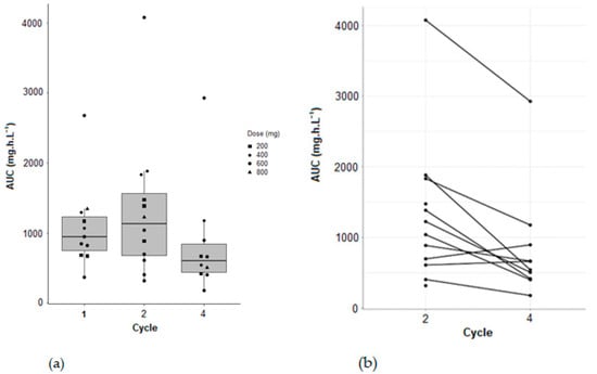 R® software (R Core Team, Vienna, Austria) was used for statistical comparison of AUC between cycle 2 and cycle 4 of patients from the clinical trial. A Wilcoxon–Mann–Whitney test with paired samples was carried out, and a significant p-value of 0.0097 was observed.