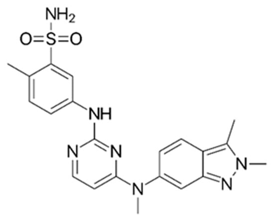 Pazopanib (Scheme 1), a multi-kinase inhibitor (MKI), was approved by the FDA (Food and Drug Administration) and by the EMA (European Medicines Agency) for the treatment of advanced renal cancer or soft tissue sarcoma in 2009 and 2013, respectively. Pazopanib targets VEGFR1, VEGFR2, VEGFR3, PDGFR, FGFR, and c-Kit with IC50 of 10, 30, 47, 84, 74, and 140 nM, respectively [].