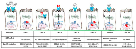 Since the discovery of the CFTR gene in 1989, more than 2000 mutations have been identified so far and about 240 can cause CF [3]. Based on the pathophysiological effects of individual variants, they have been classified into seven classes (Figure 2): class I, severely reduced protein synthesis with absent CFTR gene expression on the apical membrane; class II, impaired protein processing, folding, or trafficking, and premature degradation with severely reduced CFTR gene expression, such as F508del, the most common mutation, especially in North European countries (80–90%); class III, CFTR gene can reach the apical membrane, but the channel activation is abnormal (gating mutations); class IV, normal CFTR gene expression with reduced conductivity; class V, lower CFTR gene expression due to reduced protein synthesis; class VI, lower CFTR gene expression due to increased turnover; class VII, no mRNA synthesis and consequently no CFTR gene expression [3,4,5]. There is a correlation between CFTR gene function and clinical phenotype, with classes I–III and VII resulting in more severe disease, while classes IV–VI may have milder phenotype [6].