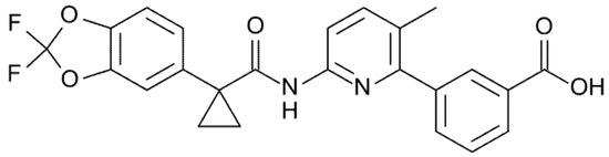 Ivacaftor (formerly VX-770, Figure 3) was the first CFTR modulator approved by the Food and Drug Administration (FDA) in 2012 with the name of Kalydeco® for the treatment of CF patients heterozygous for the G551D, the most common variant of class III. The mechanism of action of Ivacaftor consists of increasing the time of CFTR channel in open status through the CFTR channel potentiation in a phosphorylation-dependent and ATP-independent manner [10]. Ivacaftor has now been approved for patients older than 4 months with certain class III (G551D, G1244E, G1349D, G178R, G551S, S1251N, S1255P, S549N, S549R) or class IV mutations (R117H), which account for 8% of all patients with CF [11,12].
